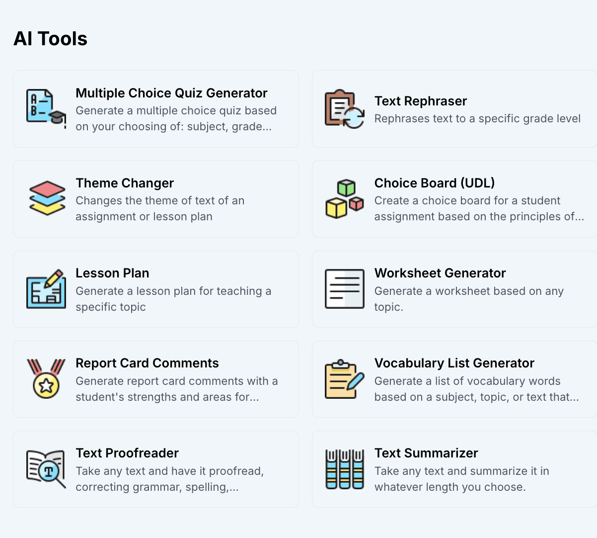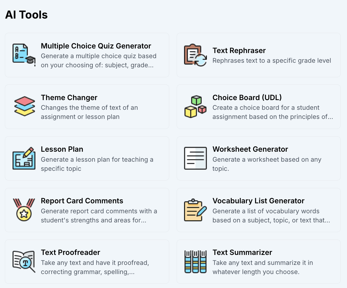 Save time with AI teaching tools that enhance your workflow. Easily generate quizzes, UDL choice boards, and enjoy a variety of other resources.