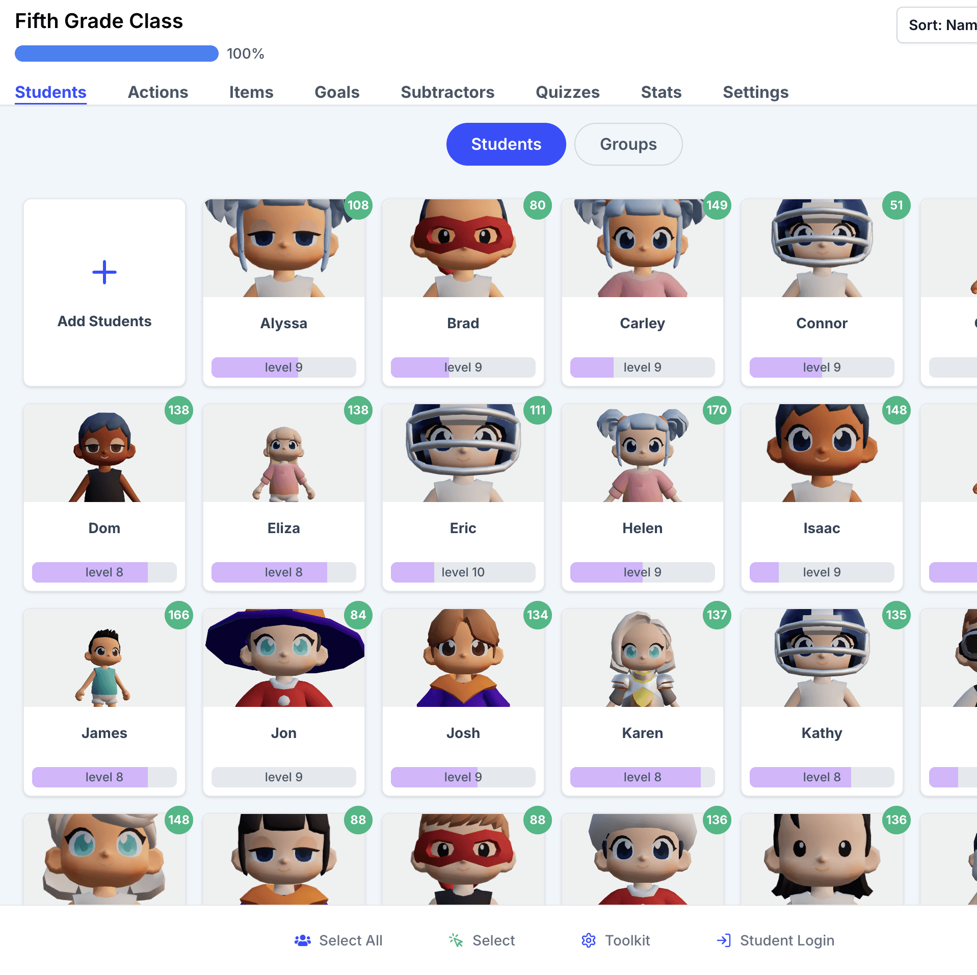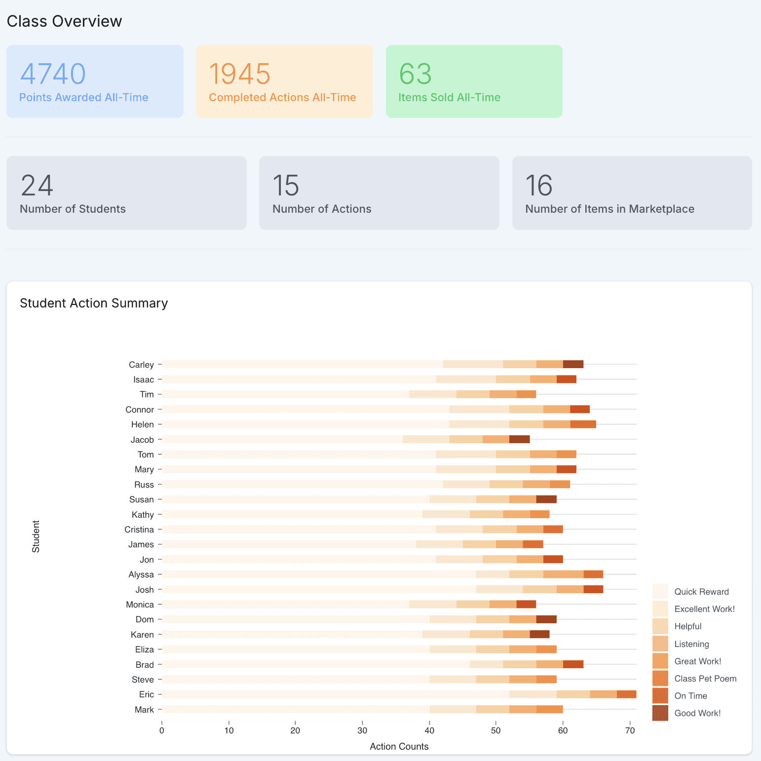 Track individual progress and class-wide engagement: View statistics on student task completion, purchased items, and overall class trends.