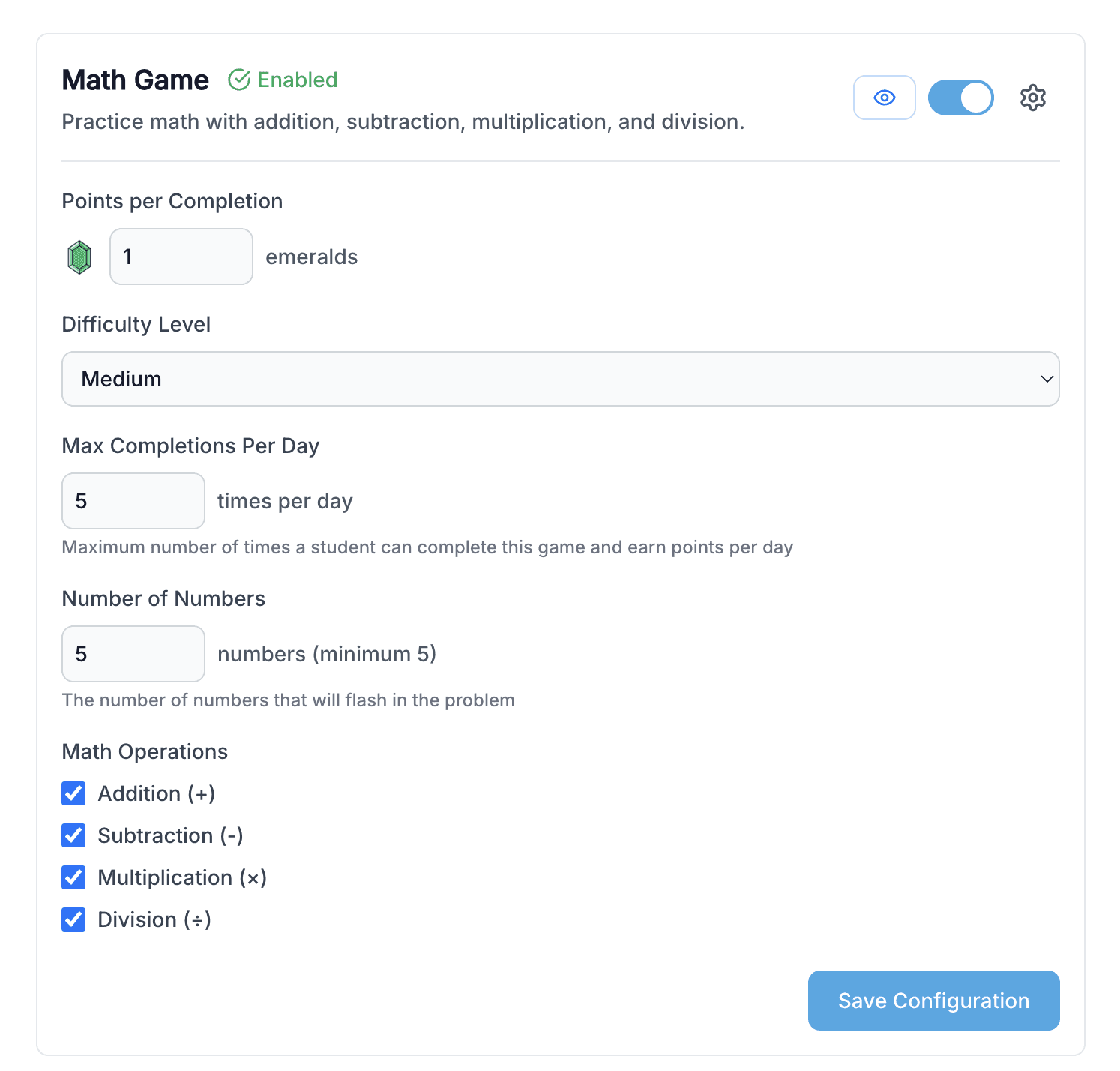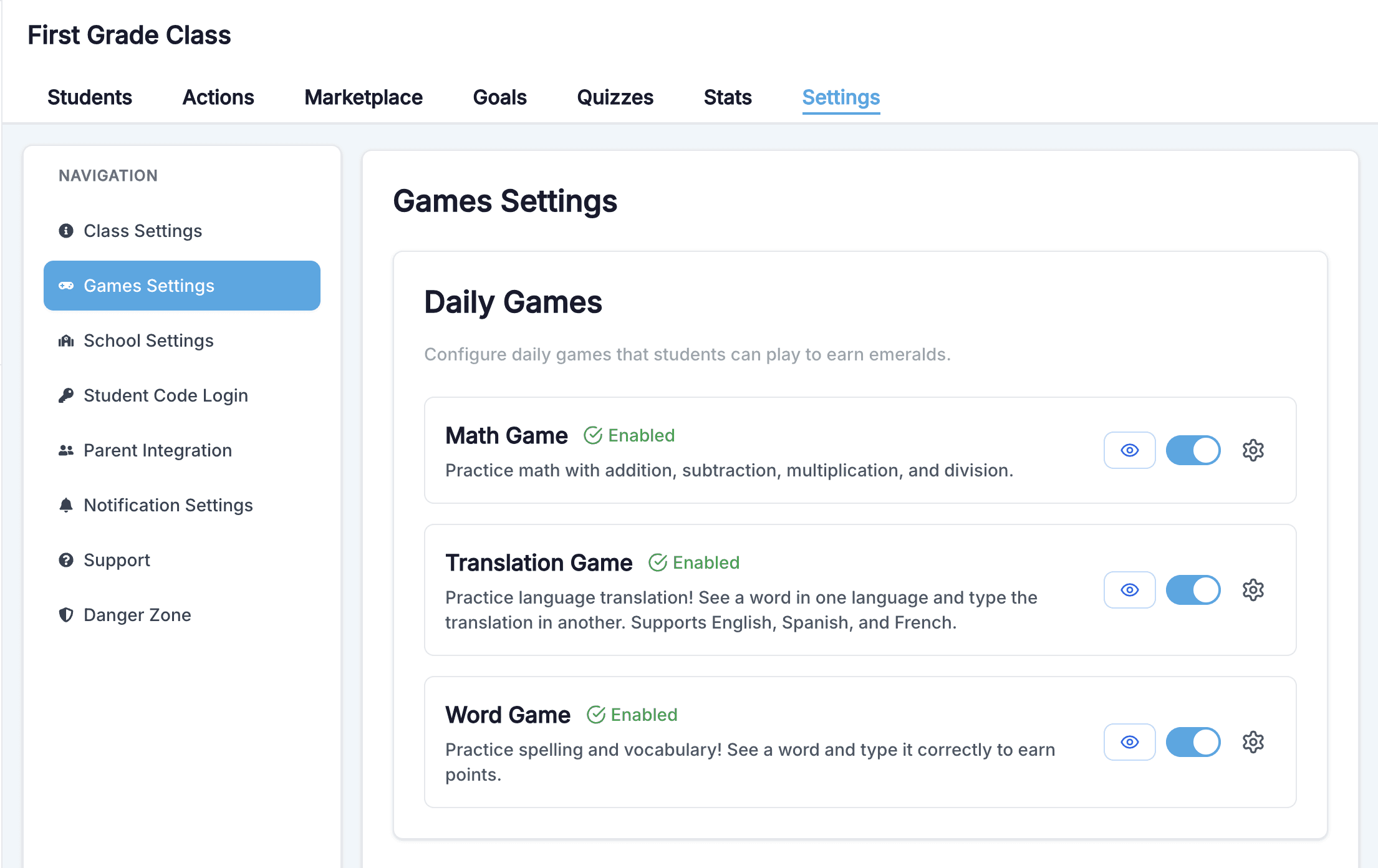 Every game includes a preview mode so teachers can test configurations before enabling them for students.