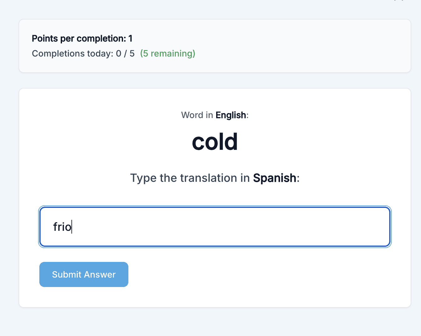 Students translate words between supported languages with instant feedback. The game supports multiple language directions and difficulty levels, making it ideal for language classes and bilingual learners.