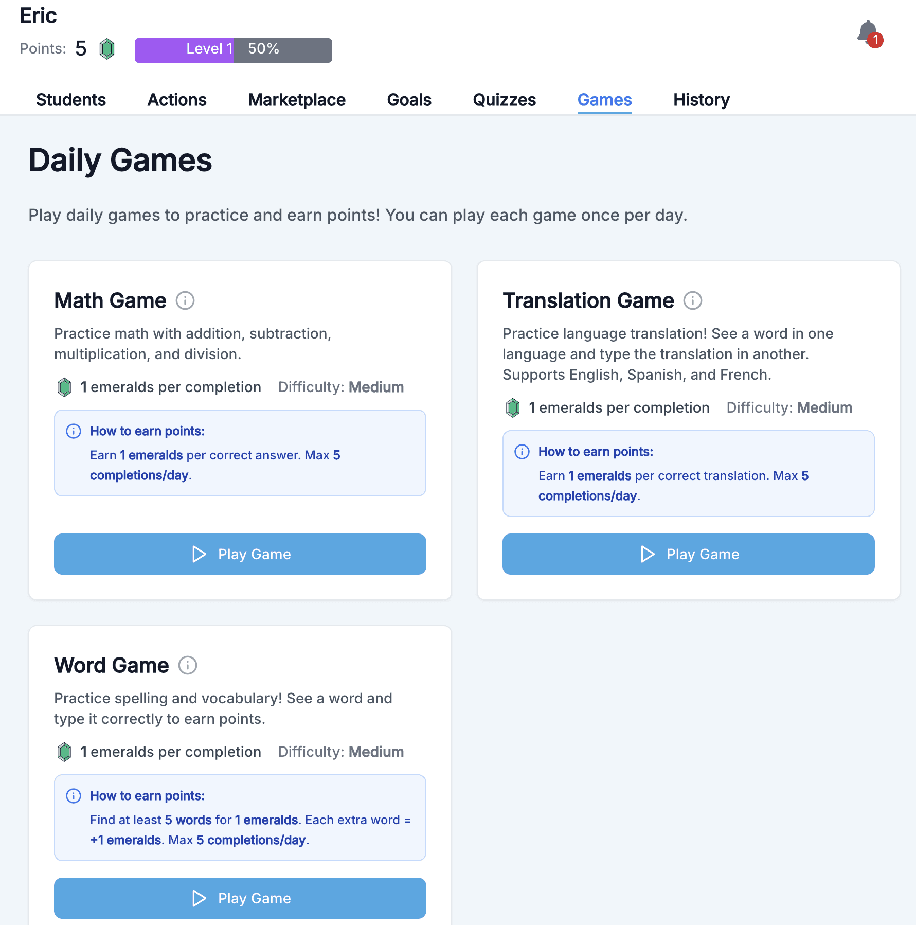 Daily Student Games in Classroom Hero transform essential skill practice into short, repeatable learning moments students actually enjoy. With three configurable games covering math, vocabulary, and language translation, teachers can reinforce learning while students earn points — without adding extra prep work.