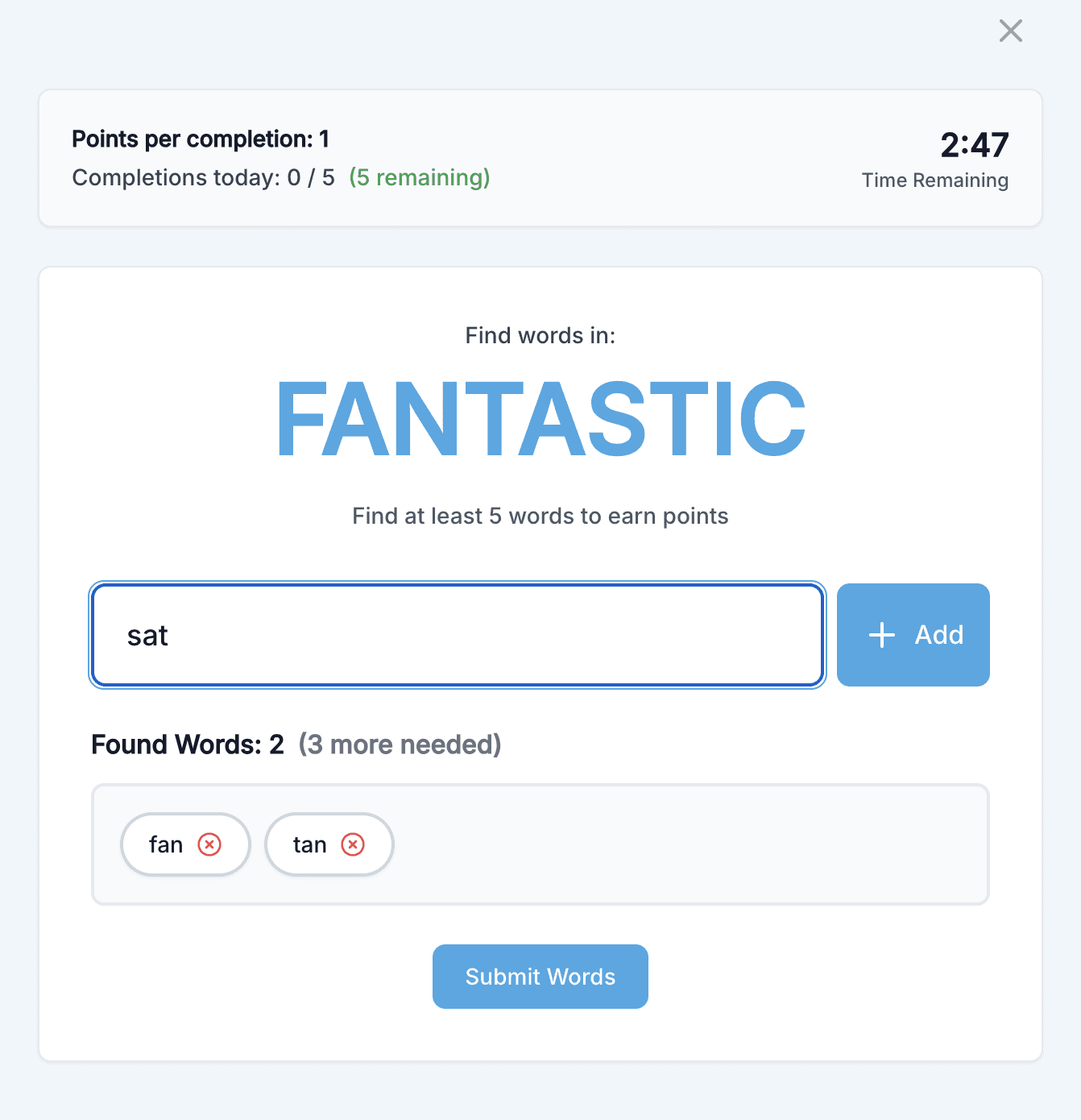 Students are given a base word and challenged to find as many valid words as possible using its letters. Each letter can only be used once per word, encouraging careful thinking, spelling accuracy, and pattern recognition.
