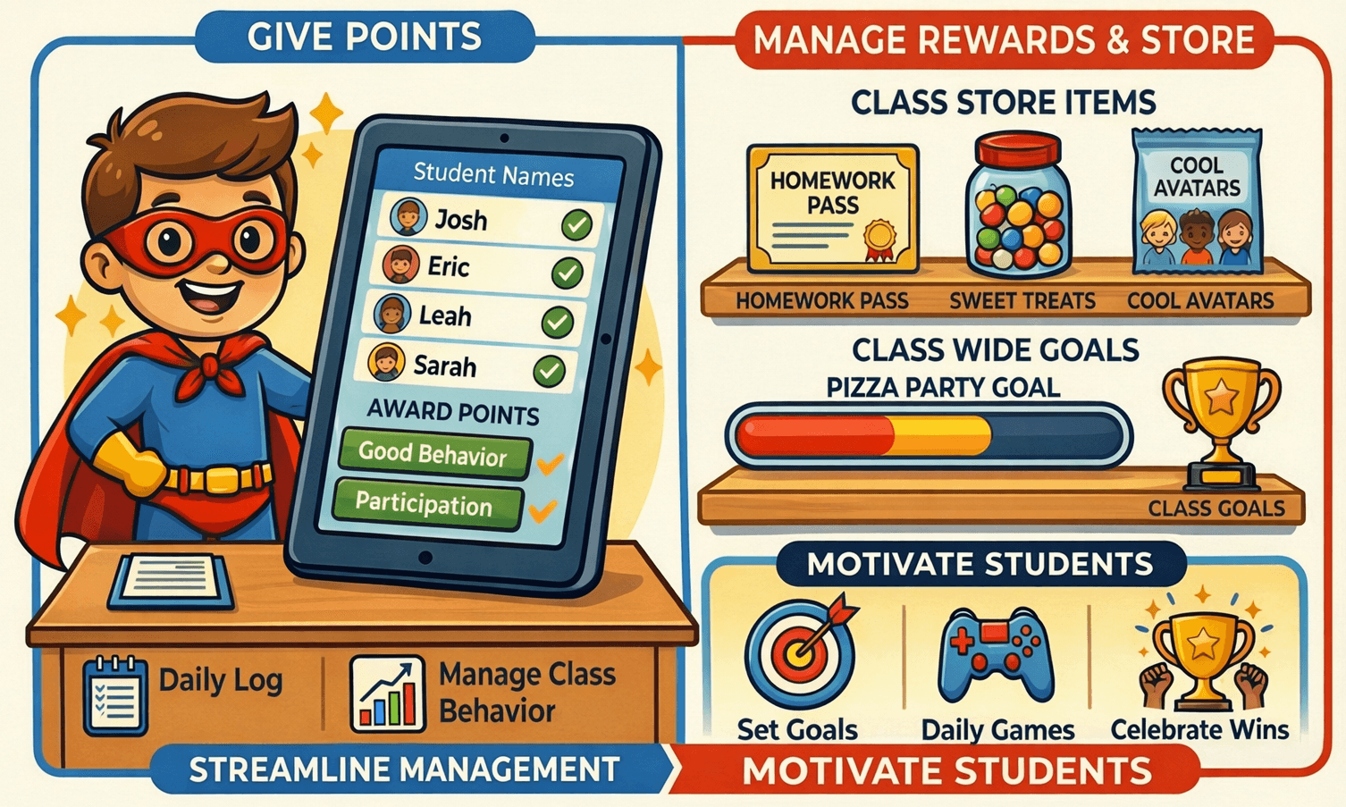 Instead of separating behavior systems, academic work, and engagement tools, Classroom Hero connects everything through a single classroom economy.